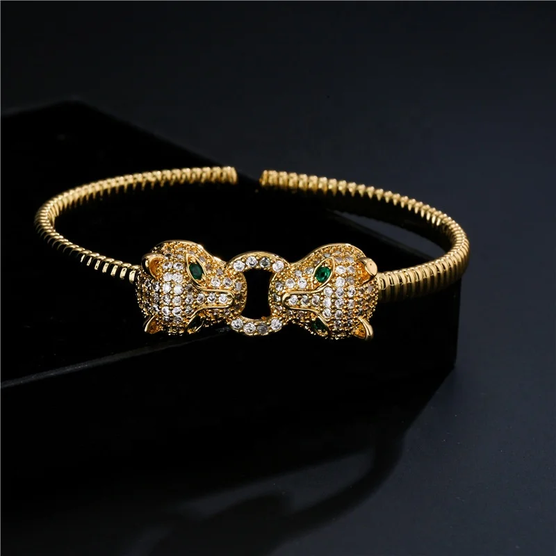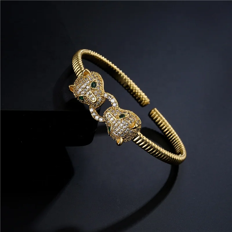 Amazon Hot sell Women’s Fashion Leopard Head 18K Real Gold Plated Micro Paved Zircon Bracelet Opening Adjustable Cuff Bangle