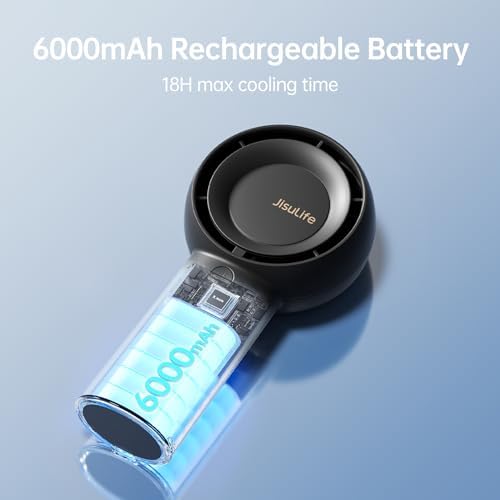 About this item Patented Turbocharged Airflow: JISULIFE Handheld Turbo Fan has 2 vortex tech patents: Air Turbo and Air Jet. The airflow is accelerated and compressed by the air duct turbine, the wind is stronger, and the wind feeling is closer to nature 5 Gear Turbo Wind: JISULIFE Portable Handheld Fan has 5 gear turbo wind for potent cooling. You just press the power button to change wind setting, short press to cycle switch low-speed (3300r/m) to high-speed (6100r/m), long-press at any gear to turn off 18H Max Cooling Time: Hand Held Fan comes with a 6000mAh rechargeable battery(twice larger than a normal hand fan), provides 3-16 hrs duration (depending on different speeds). You can charge through a regular outlet, power bank or any other device with a USB port, just 3 hrs to have a full recharge Powerful & Energy-efficient: JISULIFE Personal Handheld Fan features a high-performance motor and optimized air duct to improve wind power while minimizing noise. Compared to other hand fans, it has a faster speed (6100 r/min) and stronger wind (4.8 m/s) Handheld/Desktop Fan: JISULIFE Mini Handheld Fan comes with a lanyard and an anti-slip mat at the bottom, you can hang it around your hands as a handheld fan when outdoors, and used it as a small desk fan on a flat table. Suitable as a gift for women