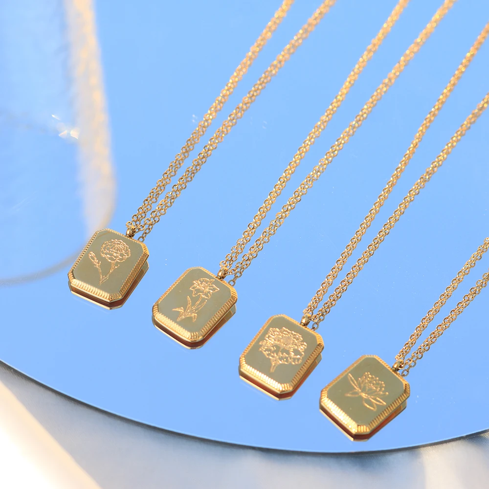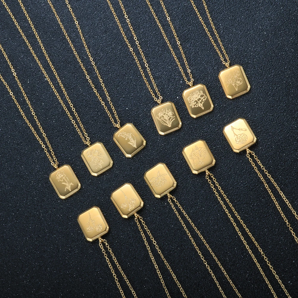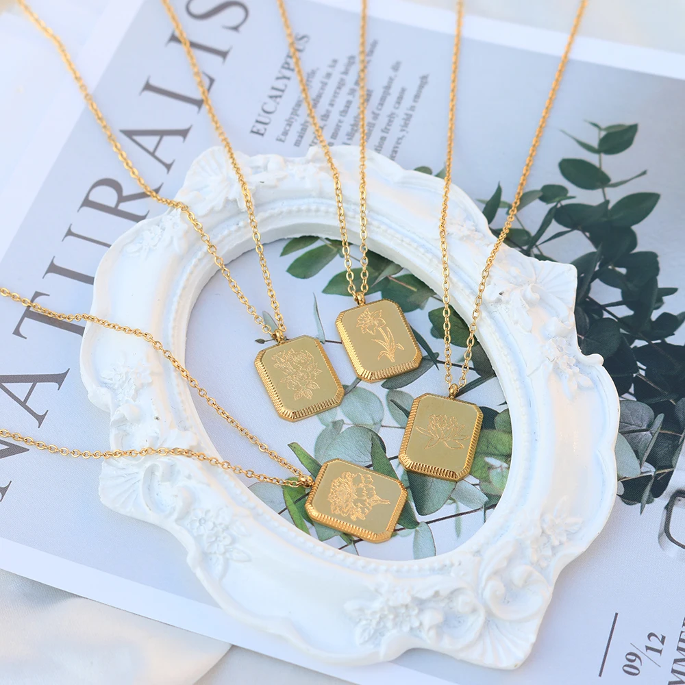 Personalized Gift 18K Gold Plated Birth Flower Necklaces For Women Stainless Steel Square Flower Pendant Charm Necklace Jewelry