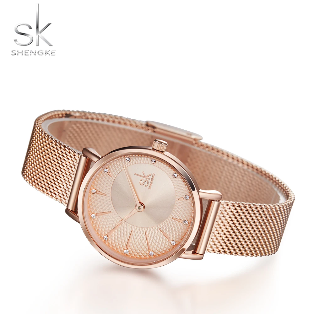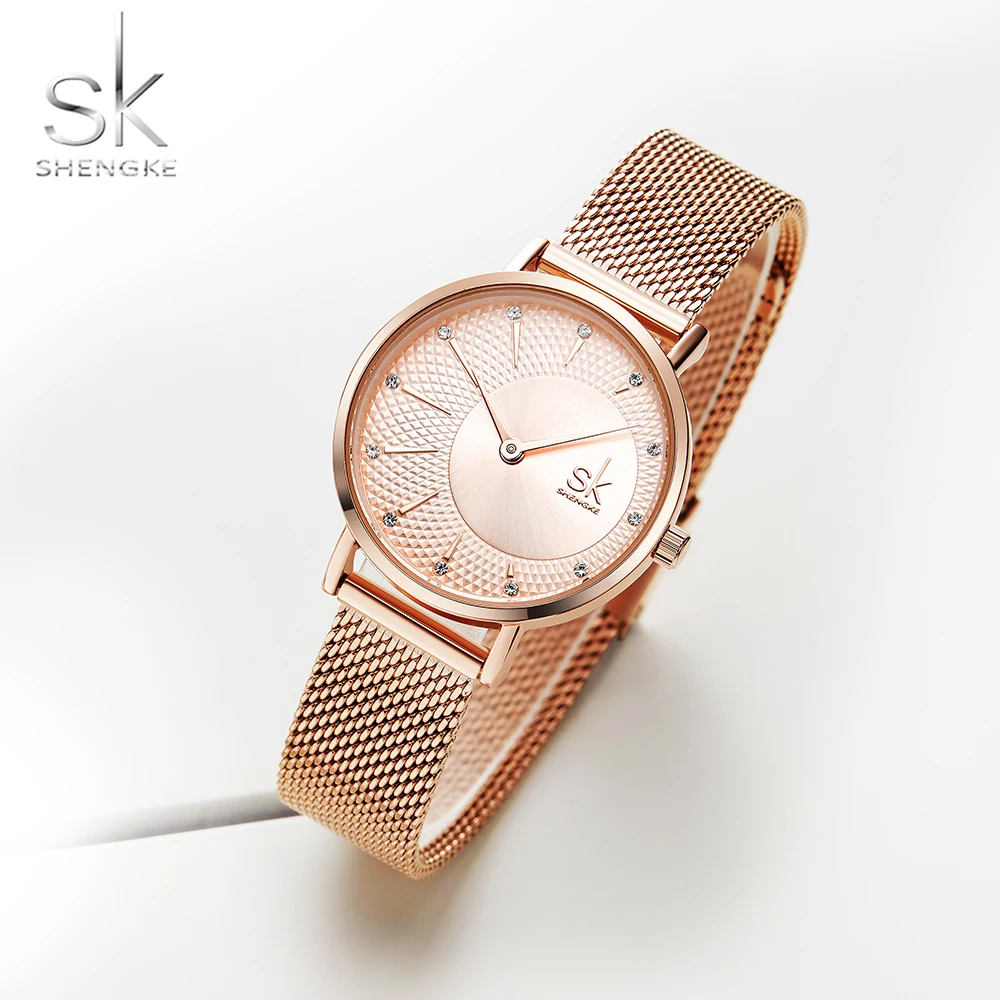 Shengke Women Ultra Thin Rose Gold Watches for Dressing Steel Mesh Beautiful Ladies Quartz Wrist Watch Bayan Kol Saati K0093